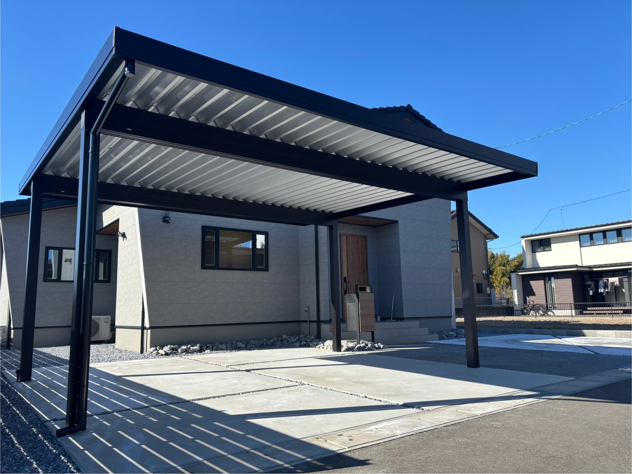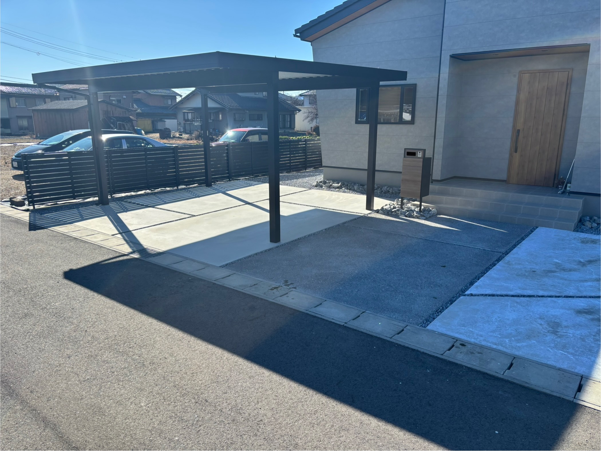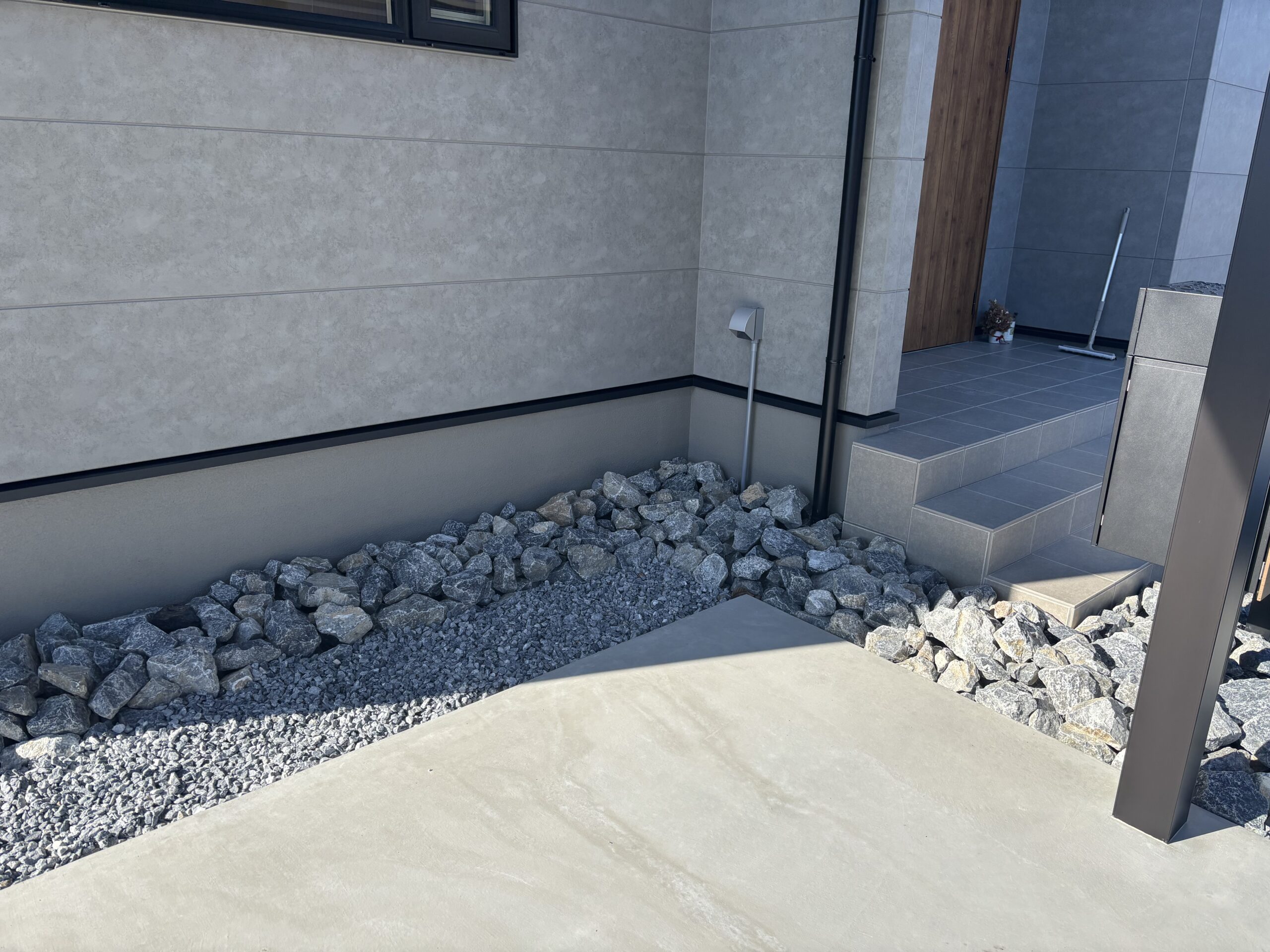 この度は弊社にご用命いただき誠にありがとうございます。 建物前に割石、アプローチを洗い出し仕上げ、製品の色を統一することでシンプルモダンな外構となりました。 またなにかございましたらよろしくお願いいたします。
